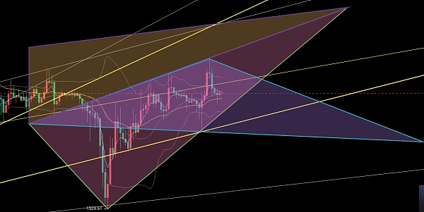 图中可以看出,目前价格处于三角区域内运行,三角上下线均有试探,但是并未有破位,暂时下方支撑是1618附近,行情回落到此位置可以适当先多,看反弹情况,只要不破位,就会延续三角区域内运行,破位企稳就会进入另一个三角区域,范围为1595-1645