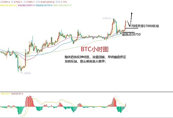 9月19日比特币(BTC)合约技术面分析:今日方面,大周期日线级别昨日报收小阳线,K线形态上连阳上涨,附图指标金叉运行,价格运行于均线上方,这样来看在大趋势上目前反弹的走势还是比较明显的,需要注意的是反弹的力度,延续性,以及向上破位的情况,交易上还是回撤做多为主,短线,这样的走势下就不要贪心,稳扎稳打最好;短周期小时图昨日欧盘价格反弹,在破位前一日高点后美盘承压,凌晨延续但价格没有向下破位,所以还是修正,早间横盘整理,当前K线形态连阳,时间在欧盘,那么破高是大概率,因此今日BTC短线合约交易策略:回撤27000区域多,止损26750区域,目标看27500-27700区域;