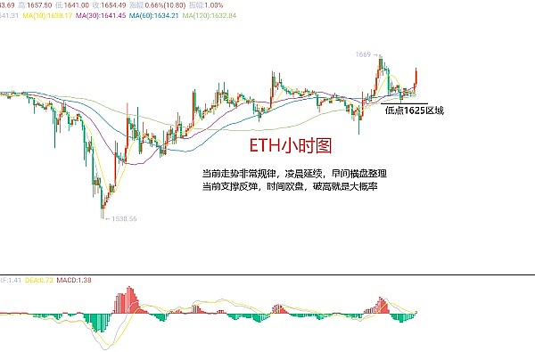 前面已经给大家讲得是比较清楚的,在前期价格下跌持续维持低位震荡后,价格在时间修正中,换空间,价格上近期数据的影响导致整体走势出现筑底反弹,而价格虽说整体力度不大,但震荡上行的走势还是非常明显的,所以昨日我们给出ETH1627区域现价多单,顺利止盈1660区域,恭喜跟上的朋友吃肉。还是强调,交易不要凭借自己的感觉来,可能对一次,但不要有侥幸的心理,否则还是走不长的。