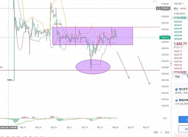 4小时以太坊来看K线在9月份出现盘行情缓慢形成一个箱体震荡,在9月11号走了一波下跌,如图所看在行情即将下跌的时候我们K线图阴线在持续放大,在这种情况我们就要在下方做好防守,如何防守我们可以找到近期低点1500这个位置,行情是短暂的,K线指标并没有在下方企稳,缓慢的持续到又回到我们前面的箱体当中,很明显这已经形成一个有力的支撑位跟压力位。操作建议近两天行情如果还在持续走跌的话,那我们还是要继续做防守了,目标可能会破近期低点1500。短期的话我们可以选择高位做空1650附近.