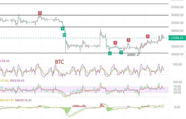 比特币目前交易价格高于 26850 美元和 100 小时简单移动平均线。小时图上还形成了一条主要看涨趋势线,支撑位在 26800 美元附近。目前来看上行的直接阻力位在 27,450 美元附近。第一个主要阻力位位于 27,500 美元区域附近,若突破该阻力位,价格可能会开始另一轮反弹。下一个关键阻力位可能位于 28,200 美元附近。明显突破 28,200 美元阻力位可能会将价格推向 29,500 美元阻力位。在上述情况下,价格甚至可能在未来几天测试 30,000 美元的水平。