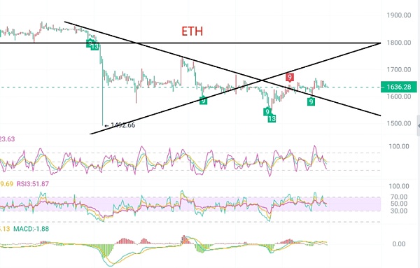 日线上ETH基本也是维持到1640-1650美元区间走动,往上没有突破前天的高点位置1668美元,但是日线上的1631美元已经是一个明显的底部。4小时盘面图来看,仍处于上升通道中运行,节奏上稍有放缓,周初连续的多头放量。空间上得到释放。有回踩修正的可能,目前处于三次上涨冲高中的回踩修正,为第三次上涨冲高做准备。二次冲高起涨点是低点防守。加上今晚凌晨周四2:00美联储FOMC会议加持,白盘回调没有给到太大空间在破新高一定是必然,所以今日主观思路维持回调低多进行。