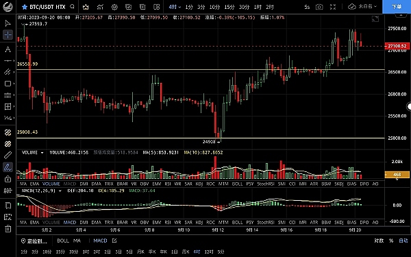 大饼昨日多次触及27500下方未能突破受阻回落,低位跌至26880一线,恭喜跟上昨日思路的朋友空单小幅获利,目前币价在27140附近运行,四小时级别行情多次回踩至ma14均线都未延续下行,随后一路上行破位前高,但力度不大多头未能延续,macd逐步缩量双线有死叉迹象,当前27500阻力有效,短期有回落需求,日线级别,上方阻力明显形成三重顶,关注回踩ma7能否撑住,不破看多头突破延续,破位则多头趋势打破高位空单继续持有,思路建议反弹高空为主低多为辅,上方压制27400-27700,下方支撑26800-26400
