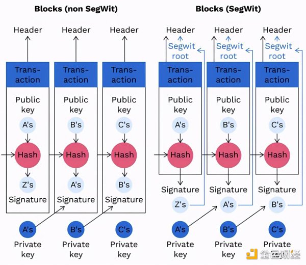 随后的僵局最终导致了一项有争议的变革——隔离见证(SegWit)。通过重组交易的存储方式,SegWit提供了适度的容量增加,同时还解决了阻碍高级功能的交易可延展性问题。