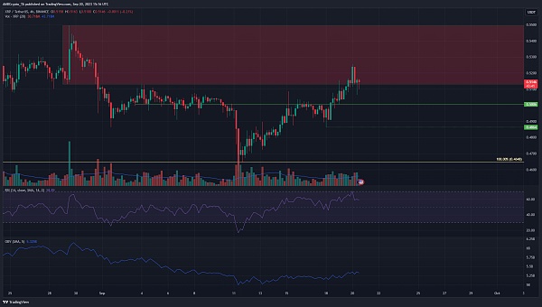 相对强弱指数 (RSI) 显示出强劲的上升势头,读数为 58,而综合成交量 (OBV) 在过去一周小幅走高。目前尚不清楚这种情况是否能持续下去,因为 0.513 美元至 0.55 美元区域(红框)是 1 日图表中的看跌订单区域。