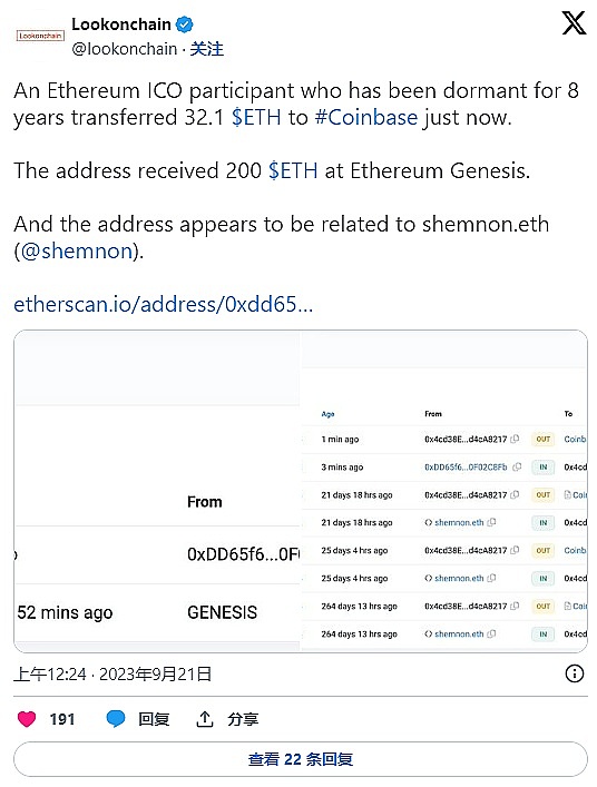 一名沉寂了八年的以太坊ICO参与者最近做出引人注目的举动,将32.1 ETH 转移到Coinbase。