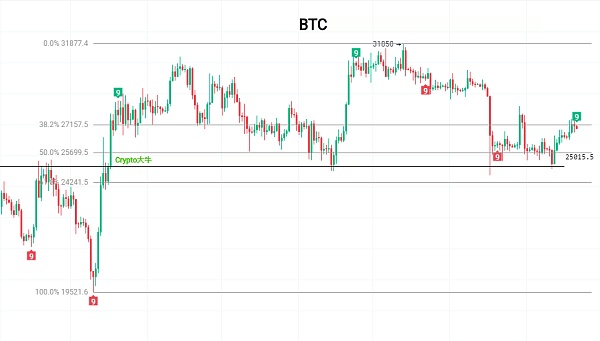 消息公布后,比特币最高摸了下27297,最低踩了下26740。27300-27500依然没有突破,去触摸下28000关口,如昨日所述,主力逼多已经兑现了不加息的预期,再往上没有一飞冲天,那就带动不了市场fomo,面临成本大大加大的风险!如果站稳26800附近,同时站稳定28000附近位置时,那么大盘将会重新开始拉升行情。
