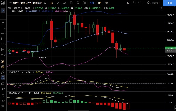 昨日整体行情呈震荡回调趋势,冲高承压于27500附近,后续持续回调连阴走低在晚间最低来到了26300附近,现行情位于26600附近震荡运行。