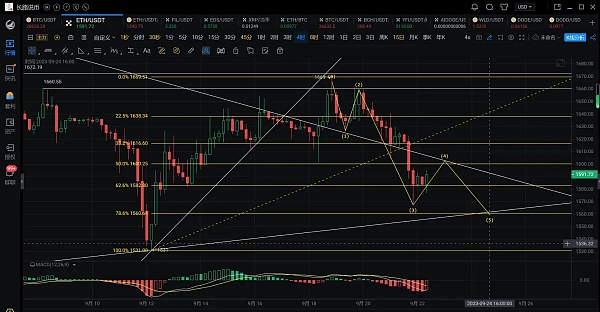 4小时线:行情反弹上方高点并未突破前高1672附近的压制,4小时线并未走出头肩底的模型,然后随着行情价格的下跌,昨天晚间跌破了下跌趋势线的支撑,顺势回踩1565一线支撑反弹,而从五浪下跌模型来看,行情走出了3浪回踩后,会有第四浪的反弹,受到斐波那契回撤线0.626处1580附近的支撑反弹,今天操作上短期看行情反弹,若能突破1600的压制,那么上方可关注到1615附近,不破可空单进场,今天白盘大概率会以震荡修复为主。下方则关注1580及1565的支撑。