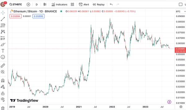 以太坊 (ETH) 兑比特币 (BTC) 触及 2023 年低点