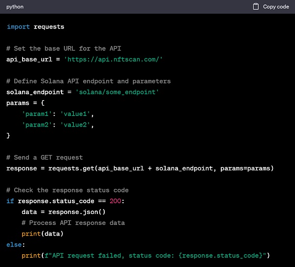 当开发者在 NFTScan 的 API 文档中找到所需的 Solana API 接口和参数后,可以使用选择的编程语言编写 API 请求代码。下面是一些通用的步骤,以及一个示例来说明如何使用 Python 编写 Solana API 请求代码: