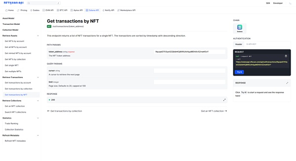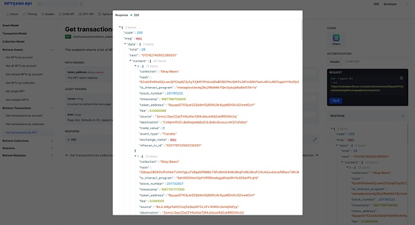 类型的接口可以方便获取 Solana NFT 在链上发生的各种交易信息,包括根据账户、集合、资产地址等获取该 NFT 的历史交易记录,返回每笔交易的关键数据。这类接口提供链上原始的区块事件数据,开发者无需处理链上提取,就可以通过简单的接口调用获得需要的 Solana NFT 交易数据。获得这些数据后,开发者可以基于此实现数据分析、交易系统等应用。