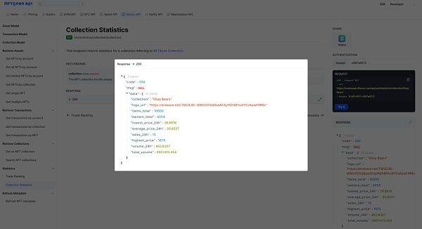 寻找所需的 API:首先需要找到 NFTScan 的 API 文档,然后找到所需要的 Solana 相关的 API 接口和参数信息。