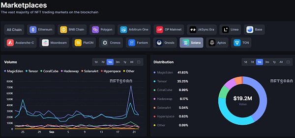 目前 Solana 链上的 NFT 交易量仅次于以太坊,主要原因是前段时间发布了 SMB 系列短期存在较高热度,根据 NFTScan 数据,显示过去一个月,Solana 链上一共产生了 $19.2M 的交易额,主要分布在 Magic Eden(41.83%)、Tensor(35.25%)等交易市场。