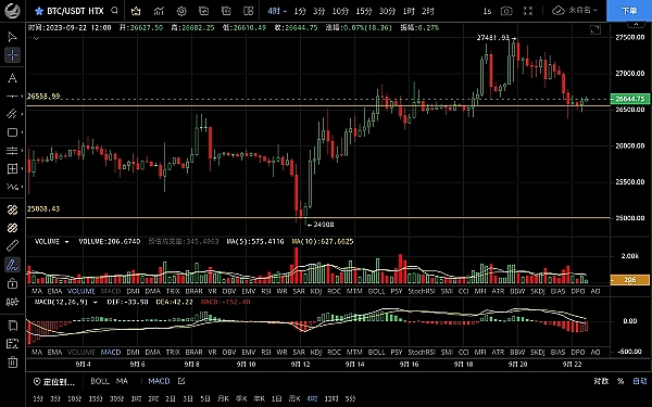 大饼昨日走势和思路一致呈连阴回落,低位跌至26376一线支撑反弹,恭喜跟上昨日思路的朋友空单获利700点,目前币价在26630附近运行,四小时级别行情二次下探未破前低走出反弹,短期空头暂时止跌,macd逐步缩量双线死叉向下,ma7均线向下指引,整体来看空头占优,预计反弹力度不会太大,日线级别受ma14均线支撑有反弹需求,上方空间不大,方向依旧是向下,但切勿追空,思路建议反弹高空为主低多为辅,上方压制26800-27200,下方支撑26400-26100