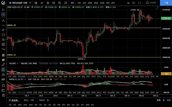 大饼昨日二次上探未破前高走出震荡下行,低位跌至26800一线支撑反弹,恭喜跟上昨日思路的朋友空单获利500点,目前币价在27030附近运行,四小时级别行情滞涨回落,下方受ma30均线支撑未能有效跌破,macd空头逐步放量双线死叉向下运行,ma7均线拐头向下指引,短期来看走势偏向回踩,日线级别多头趋势打破k线连阴下行,若能收线在ma7下方则空头延续下行,整体来看上方空间不大,思路没有改变依旧是高空为主低多为辅,上方压制27400-27700,下方支撑26800-26400