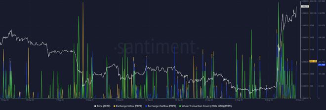 交易所的大量资金流入和流出表明投资者活动有所增加。Wintermute Trading 的数据显示,“一家大型做市公司在今天的转账中将 8.3 万亿个 PEPE 转移到了中央交易所。”按照目前的价格计算,这大约价值 550 万美元。另一方面,短钱包地址为0x9d5的加密鲸鱼主动从交易所收集了大量PEPE,而许多至少10万美元的PEPE中心在白天被转移到交易所。这可能是有意出售的迹象,并威胁到 PEPE 的上行潜力。