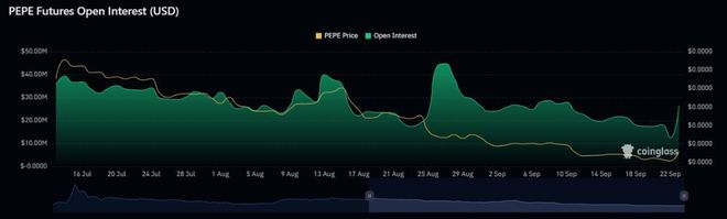 加密货币衍生品数据分析平台Coinglass的数据显示,PEPE的未平仓合约增长了110%,达到1392万美元的变化。具体来说,9 月 22 日至 23 日期间,它从 1,257 万美元增至 2,649 万美元。