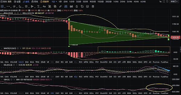 极短周期4H 走势图展现出来了,和当前价格通道结合出一副先扬后抑的走势。当前布林带三条轨迹线收口极度收缩,当前击穿下轨线1585也就是说如果短期无法再1585上方企稳下跌通道将延续。