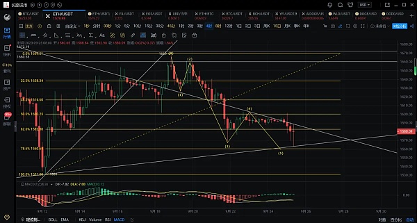 以太坊周末两天再次出现震荡一直围绕1585-1600附近震荡,今天凌晨再次反弹1600失利后顺势回踩,刚刚最低跌至1562附近,插针反弹,现行情位于1580运行。