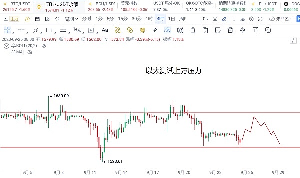 周一之后行情开始波动加快,晚间大饼最高反弹26700点以上,以太来到1600上方,短期没有站稳,快速向下插针。早间延续下跌形态,大饼破位了前面的低点,创下了新低,空头趋势较为明显。日线级别来看,KDJ指标数值变为负数,说明下跌的情绪进入超跌,MACD指标横盘于零轴下方,26000一线是前期横盘拉升的位置,短期筹码较为稳固,预计大饼还要再次试探上方压力,去测试27000一线的抛压。以太的支撑在1560附近,早间已经测试了下方的支撑情况,以太上方压力在1640—1660区域,很有可能再次去试探。