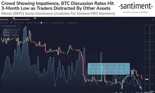 数据显示,近期社交媒体上围绕比特币的讨论已降至较低水平,这表明投资者开始关注山寨币。