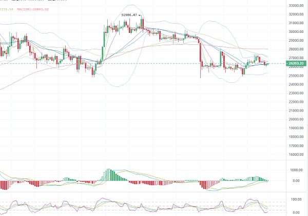 从日线级别来看,比特币经历了冲高回落的调整,回到了布林带中轨下方的盘整区间。多头的强势再次消失,日线图出现下跌的情况,不断创新低。虽然回落空间不算太大,但整体上依旧走下行趋势,连续的小阴K线进一步压制了上涨空间。在形成下探回升的转换形态之前,比特币将继续保持弱势,并受到中轨的支撑,开始横盘整理。MACD多头动能柱开始缩量,预计会在26000上行。关注26000附近的情况,同时上方的压力位于26800附近。在一小时级别上,自24900位置形成小底以来,比特币经历了上行通道的突破,但随后回调导致连续两天的震荡走势。当比特币冲高至26600后,继续下行,表现出弱势和反弹乏力的迹象。布林带呈现较大的张口,一根阴k直接击穿了下轨线,红色的空头能量柱表明空头力量强劲。目前比特币处于弱势震荡下行的状态,高点不断下降。在这种情况下,我们可以先参考区间思路进行布局。上方关注26800一线压制,下方关注25800一线短期支撑。