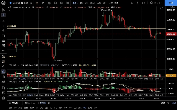 大饼昨日再次跌至26000一线支撑反弹,高位触及26449一线承压回落,目前币价在26348附近运行,四小时级别26000整数位没有跌破形成双底结构走出一波反弹,macd空头转多双线有金叉迹象,但动能不足,未能站稳26400上方,短期有震荡回落需求,日线级别整体走势表现明显弱势,一直处于区间震荡多空拉扯,空头正在蓄势中,但区间不破震荡将持续,大方向依旧是以空头为主,思路建议反弹高空为主低多为辅,上方压制26400-26700,下方支撑26000-25600