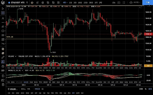 以太坊多次试探1560支撑都未曾破位,随后行情走出反弹一路上行至1597一线承压回落,昨日空单小幅获利,目前币价在1592附近运行,四小时级别macd多头逐步放量双线金叉向上,ma7均线拐头向上指引,短期虽偏向多头,但1600关口阻力较强,反弹力度薄弱预计突破概率不大,日线级别上方承压明显,整体处于窄幅区间震荡,未站稳1620前看空思路不变,日内建议反弹高空为主低多为辅,上方压制1600-1620,下方支撑1560-1530