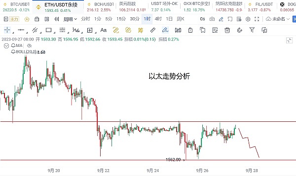 BTC:行情似乎没什么变化,小区间窄幅波动,上方阻力在26450,下方支撑26050。日线保持布林带中轨运行,短期来看,上涨的动能在消弱,大幅反弹的可能降低,MACD红色量能柱即将变绿,双线在零轴下方交汇。一小时级别K线站上布林带中轨的时间减少,更多的是运行于下轨附近,整体走势较弱,日内建议反弹做空为主。建议26300—26400附近空,目标25800—25500。
