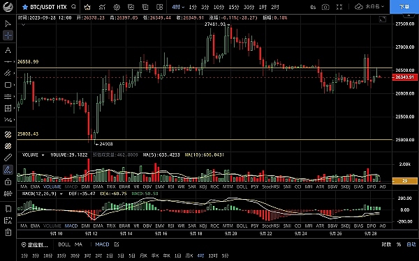 大饼昨日白盘呈多头走势,一路上行突破多个压制,最高触及26848一线承压回落,恭喜跟上前期思路的朋友空单获利600点,目前币价在26370附近运行,四小时级别行情直线拉升后未能延续多头走势,随后直接回落跌至起涨点附近,吞没白天的涨幅,macd多头运行双线金叉向上延伸,虽多空反复但空头未能跌破前低,底部在逐渐抬高,同样上方压制较强想要突破有一定难度,日线来看走势和四小时没多大变化,预计震荡为主且区间逐渐变窄,短期思路建议高空低多对待,上方压制26800-27000,下方支撑26100-25800
