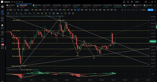 以太坊上个交易日早盘处于震荡运行中,午间开始反弹,晚间最高涨至1635一线承压,走出V形反转,重新跌回1582附近反弹,现行情位于1600附近震荡。