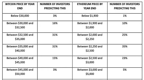 在接受调查的机构投资者和财富管理公司中,15%的人预测比特币的交易价格将在40,000美元至45,000美元之间,而只有1%的人预计价格将超过50,000美元,3%的人预计比特币的价格介于最后两组之间。