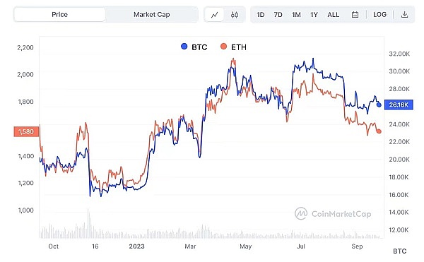 观察自2022年9月15日以太坊合并以来的比特币价格表现,我们可以看到比特币价格相对以太坊有所增长。