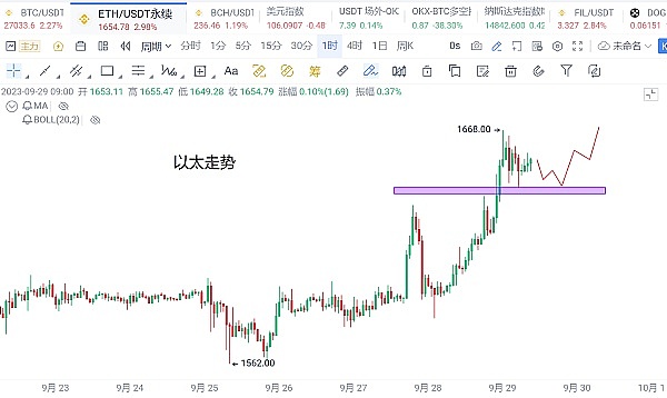 行情上涨的幅度超出市场预期,昨日大饼和以太纷纷收出大阳线,在国庆节假期临近,还是现货的主力入场导致。大饼横盘在27000附近,上下震荡的空间比较狭窄,主力在消化筹码,拉升也要停顿休息,小时线,K线强势破位各周期均线,布林通道大幅向上开口,MACD指标在高位横盘,KDJ即将金叉。目前大饼的支撑区间在26800—26900,关注回踩点,逢低做多为主,建议26800—26900多单,目标27500附近。