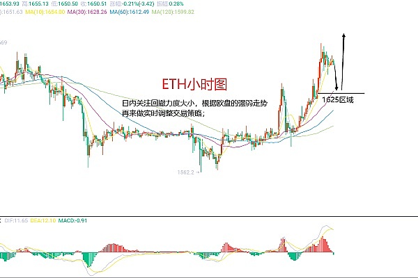 今日周五在交易上大家要谨慎一些,走势方面还是明显的震荡上行趋势,价格破高但延续的问题还需要关注,按照传统规律来说,欧盘价格破高,美盘延续,凌晨修正这是正常的,但近两个交易日的走势欧盘虽说破高了,但美盘力度不大,主要是震荡为主;这要注意;昨日操作方面,我们给出ETH现价1600区域多,止盈1635区域,顺利止盈,跟上的朋友吃肉。
