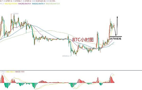 9月29日比特币(BTC)合约技术面分析:今日方面,大周期日线级别昨日报收小阳线,K线形态上连阳上涨,价格运行在均线上方,附图指标金叉二次放量向上,那么在大趋势上涨还是明显优势的,昨日也强调过了,收线和延续是关键,而昨日价格顺利破高,也就预示着上涨的走势,下跌就有难度了;短周期小时图昨日欧盘震荡上行,美盘价格延续破高后承压回撤,高点位置在27300区域,起涨点26450区域,当前价格承压,价格震荡下行,附图指标与死叉迹象,日内还是要回撤修正的,但是如果今日要看日线延续收阳,那么回撤就不能大,这是规律,否则难涨;因此今日BTC短线合约交易策略:回撤26700区域多,止损26400区域,姆比哦看27200-27300区域;