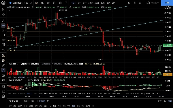 以太坊昨日凌晨最低回踩至1583一线后支撑反弹,白盘一路上行,多头发力突破前高至1668一线承压回落,目前币价在1654附近运行,四小时级别行情整体沿ma7上行走出多头排列,macd多头逐步放量双线金叉向上延伸,多头表现较为强势,短期暂时滞涨陷入高位震荡,虽有回落但力度不大,未破ma7前依旧是多头趋势,日线级别重点关注收线,若收十字阴线则反弹结束继续走下行,若收阳线有机会试探1700阻力区域,日内走势缓慢建议观望为主,激进逢高做空为主低多为辅,上方压制1670-1700,下方支撑1640-1620