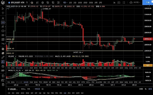 大饼这两日走势一致呈白盘震荡晚间拉升,凌晨高位触及27314附近承压回落,低位跌至26851一线,目前币价在26969附近运行,四小时级别k线六连阳,直线拉升后没有太大延续性,收上影线后走出一波回调,ma7不破则多头趋势依然存在,macd多头运行双线金叉向上,整体来看走势偏向震荡,多空反复没有延续性,日线级别整体受ma60均线压制未能有效突破,短期走出回踩预计力度不会太大,白盘节奏比较慢,区间未破前临近上方阻力建议反弹高空为主低多为辅,上方压制27500-28000,下方支撑26700-26400