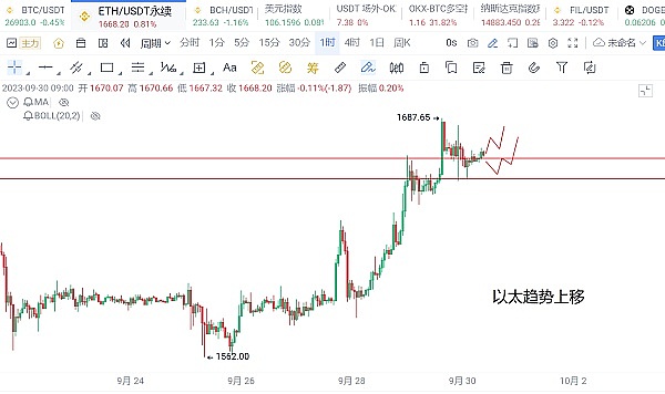 以太走出独立行情,回踩的低点越来越高,趋势不断上移,日线运行于布林带上轨附近,短期拉升的有点急促,但是强势行情之下,多头不会给到空头长时间的入场机会。指标方面KDJ和MACD全部金叉向上发散,红色量能柱持续放量,1650—1640下方区域支撑强烈,白盘还要冲高昨日高点,如果没有站稳,回踩之后还会蓄势待涨,思路做多即可。建议1665—1655附近多,目标看到1685—1700,跌破1655,补仓即可,上看目标不变。