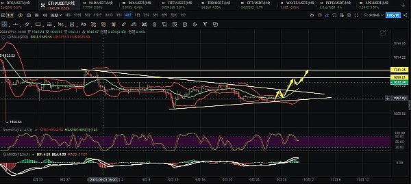 以太的话突破1700的压力看到1740附近,空单也可以止盈点位相应埋伏!