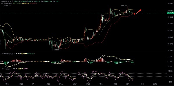 1小时图来看,BOLL布林通道上轨平行向前推进,币价运行在下轨上方支撑,MACD粘合空头能量缩量,KDJ三线向上金叉,4小时图来看,布林带上轨开始缩口,K线运行至中轨上方,附图MACD双线运行至零轴上方形成交叉向下,KDJ三线向下,短期多单进场。