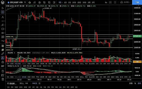 大饼昨日整体走势呈小幅上行空间不大,高位触及27100附近承压回落,目前币价在27053附近运行,四小时级别行情整体再次回到ma7均线上方运行,macd无量双线走粘合,短期来看行情虽有上攻的需求,但碍于上方压制较强且周末力度不大,预计走高位震荡的概率较大,日线级别反弹高点逐渐降低同样底部在抬高,整体活动空间逐渐变窄,若日线能站上27100也就是ma7均线上方突破的概率较大,不破则延续震荡走势,思路建议高空低多对待,上方压制27400-27800,下方支撑26800-26600