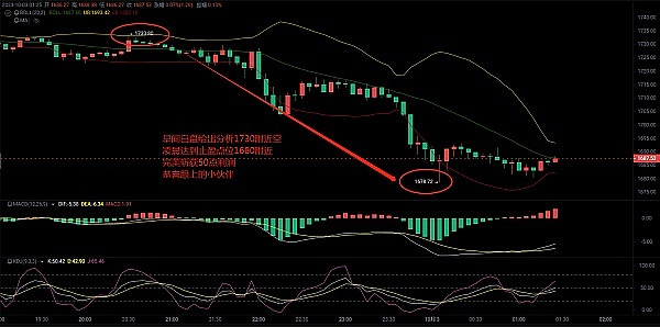 以太坊斩获50点利润,白盘给出分析1730附近空单,凌晨达到目标点位1680附近。