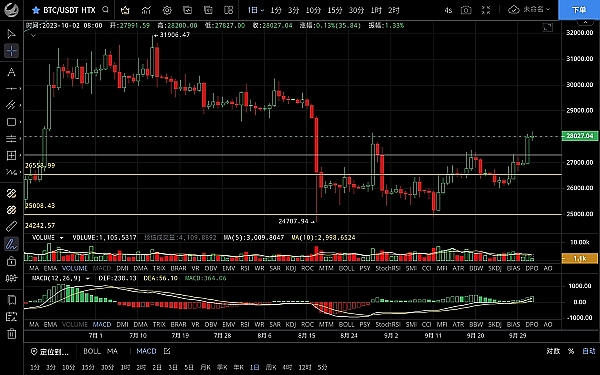 大饼周末两天波动不大,早间多头加速直线拉升,最高触及28200一线承压回落,恭喜跟上昨日思路的朋友多单获利1000点,目前币价在28050附近运行,四小时级别macd逐步放量双线金叉向上指引,ma均线向上发散,短期走势多头表现较强,但预计延续的可能性不大,目前28200附近是月线周线的压制位置,可能会向上插针,但站稳的概率不大,日线级别来看k线大阳拉升,币价预计会走出一个回调修复,随后再进一步拉升,思路建议回踩后低多为主高空为辅,上方压制28200-28500,下方支撑27800-27400