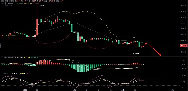 早间行情一波下探突破布林带下轨受阻反弹至1636附近运行,也是走出一波小行情。1小时图来看,BOLL布林通道上轨呈现缩口向下趋势,K线攻破下轨来到1615受到支撑反弹1638附近运行,MACD粘合交叉向下多头能量住缩量,KDJ三线拐头向下,4小时图来看,布林带上轨向上开口,币价运行至下轨上方,附图MACD空头能量住开始放量,KDJ向上金叉。东哥建议短期回踩继续空单进场。