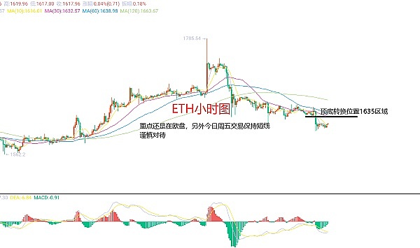 10月6日以太坊(ETH)合约技术面分析:今日方面,大周期日线级别昨日报收中阴线,K线形态上连阴下跌,且昨日美盘价格冲高回撤后跌破前一日低点位置,价格运行于均线下方,附图指标多头动能缩量,快慢线有粘合死叉迹象,那么在趋势上目前下跌明显优势,需要注意的是下跌的力度以及延续性;短周期小时图昨日高点承压位置在1650区域附近,今日看延续下跌那么反抽不能过开跌口位置,否则难跌,而前期的低点1630是顶底转换的阻力位置,当前K线形态连阳,附图指标缩量,日内是有反抽修正的需求,因此今日ETH短线合约交易策略:现价1618区域直接多,止损1603区域,目标看1635-1640区域,反抽1640区域空,止损1655区域,目标看1610-1605区域;
