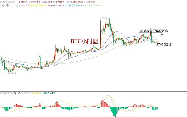 10月6日比特币(BTC)合约技术面分析:今日方面,大周期日线级别昨日报收中阴线,K线形态上连阴单阳,附图指标多头动能缩量运行,另外,昨日下跌时间是在美盘,日内还是震荡上行修正的走势,且其形态上也是冲高回落,这样来说趋势虽说明显,但还是缺少爆发和力度,当然延续性也是还需继续关注;短周期小时图美盘价格冲高承压高点在28150区域附近,而回撤的力度不大,并没有破位前一日的低点位置,所以不是极弱走势,而后价格横盘整理并没有延续,当前价格在低位,K线形态连阳,那么日内有反抽修正的需求,因此今日BTC短线合约交易策略:现价27460区域直接多,止损27200区域,目标看27760-27800区域,反抽27800区域空,止损28150区域,目标看27350-27300区域;