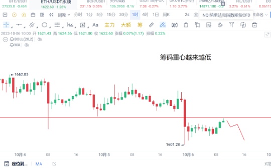 以太小时线同样来到布林带中轨附近,小时线形成红三兵走势,布林带中轨的压制位在1625,如果行情强势上拉,那么下一个冲击点在1630,这个点位也是今天埋伏的好点位。四小时方面,以太布林带通道向下运行,证明趋势在往下走,所以日内的思路还是反弹空为主。建议以太反弹1625—1630附近空,目标1600—1580.