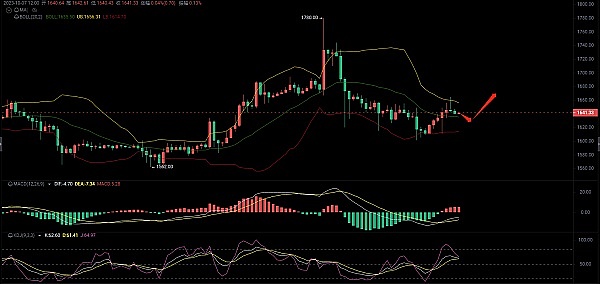 1小时图来看,BOLL布林通道上轨呈现开口向上,K线攻破上轨未能企稳回落至中轨上方运行,MACD双线粘合空头能量放量乏力,KDJ抬头向上金叉,4小时图来看,布林带上轨呈缩口状,币价运行至中轨上方,附图MACD多头能量开始放量,KDJ三线向下死叉,东哥建议多单进场。